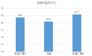 采用同一品牌汽車點火器,在室溫下對不同廠商IGBT器件進行對比測試,測試條件為25Hz/3.5ms,實驗結果如圖5所示。從圖中可看出貝嶺BLG3040產品的溫升表現優(yōu)于主流廠商產品。