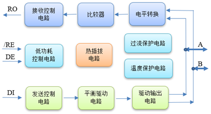 具有熱插拔功能的RS-485收發(fā)器,可以有效地避免上述的潛在問題。圖2是上海貝嶺高速RS-485收發(fā)器BL1590的功能框圖,和通用的RS-485收發(fā)器相比,增加了熱插拔電路模塊,另外內(nèi)置的過流保護(hù)和溫度保護(hù)模塊也更適用于嚴(yán)苛的應(yīng)用場(chǎng)景。
