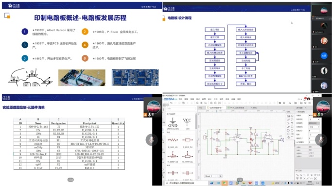 線上課程以工程案例為背景,以PCB基礎(chǔ)知識(shí)和電路板設(shè)計(jì)流程為主線,介紹了印制電路板發(fā)展史、元素組成、電路原理圖設(shè)計(jì)、PCB設(shè)計(jì)軟件應(yīng)用,以及工業(yè)制版工藝和實(shí)驗(yàn)室制版工藝,更引入了前沿新材料和新技術(shù)的介紹。
