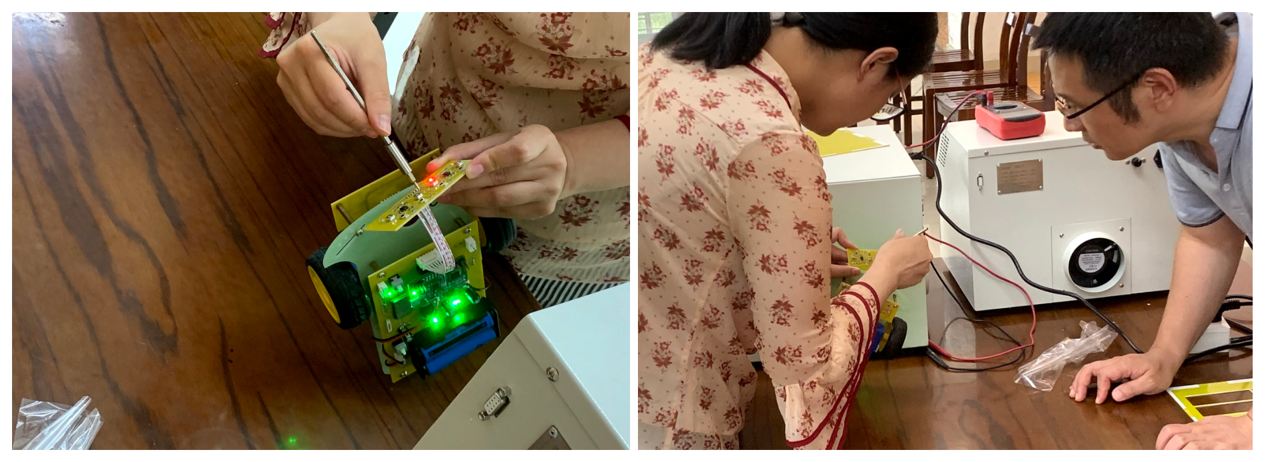 在實(shí)操訓(xùn)練中,教師們在夢之墨工程師的指導(dǎo)下使用TSeries PCB快速制板系統(tǒng)制作電路板,并進(jìn)行焊接和組裝調(diào)試,最終完成循跡小車的賽道驗(yàn)證。通過實(shí)際操作,讓教師們了解T Series設(shè)備快速打印和綠色環(huán)保等特點(diǎn),并模擬競賽場景體驗(yàn)其在比賽中的便捷性和可靠性等優(yōu)勢,很適合在各項(xiàng)比賽中應(yīng)用。