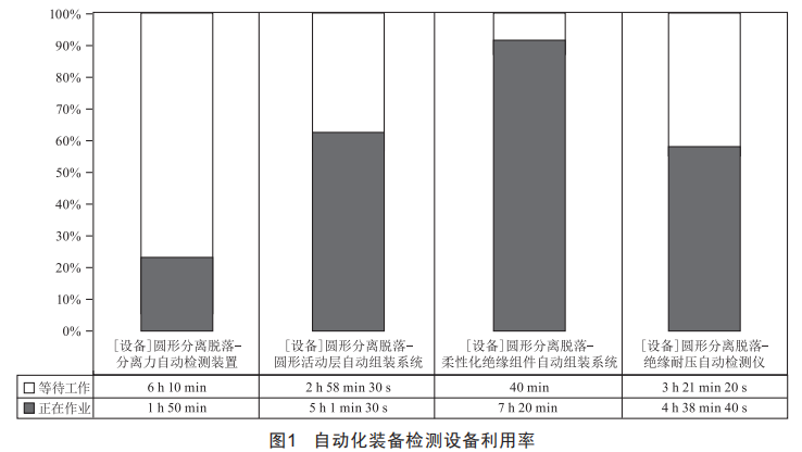 (1)柔性化絕緣組件自動(dòng)組裝系統(tǒng)前期處于滿負(fù)荷狀態(tài),分離力自動(dòng)檢測裝置、圓形活動(dòng)層自動(dòng)組裝系統(tǒng)、絕緣耐壓自動(dòng)檢測儀作業(yè)時(shí)間分布較為均勻。