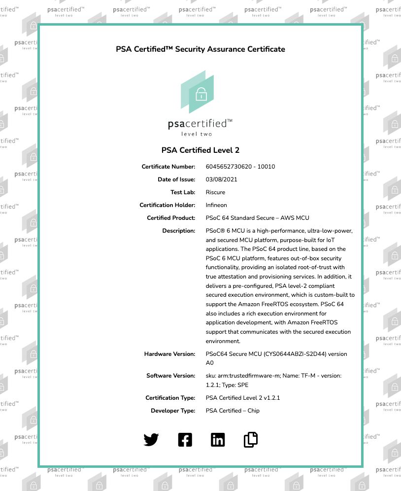 圖:PSoC 64 Standard Secure – AWS MCU — PSALevel2認證書v