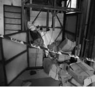 (5)升降箱體滿載的清潔用品類貨物,由于墜落撞擊的原因貨物撒落滿地,如圖4所示。升降箱體內(nèi)留有死者的血跡。