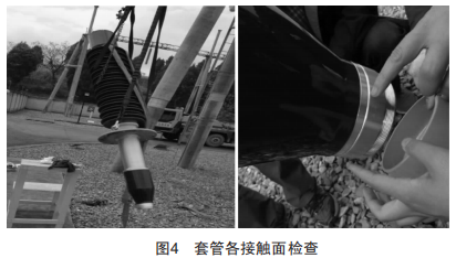 隨后進(jìn)行檢修,發(fā)現(xiàn)該套管存在內(nèi)漏現(xiàn)象,檢修人員將套管油位降至一半,約10h后套管油位再次滿位。鑒于以上情況,決定立即更換該套管。3月25日,檢修人員更換了新套管,并對(duì)原套管進(jìn)行懸吊檢查,如圖4所示。在清除套管表面、內(nèi)壁油跡后,通過長(zhǎng)時(shí)間觀察并未發(fā)現(xiàn)套管法蘭下端各連接面有滲油現(xiàn)象。