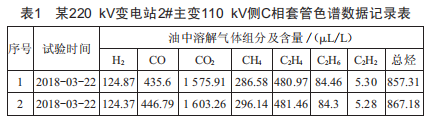 2018年3月22日,在某220kV變電站2#主變例行試驗(yàn)中,發(fā)現(xiàn)2#主變110kV側(cè)C相套管總烴含量嚴(yán)重超標(biāo),測(cè)試數(shù)據(jù)如表1所示。