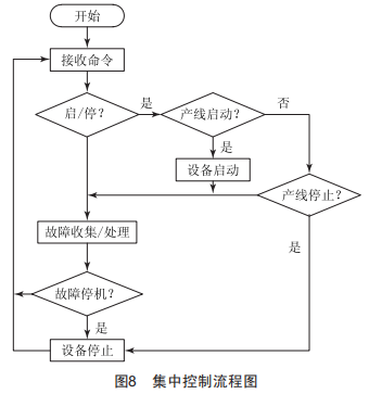 由于以往產(chǎn)線各個設(shè)備間相互獨(dú)立,每個工序操作人員無法及時判斷其他工序設(shè)備運(yùn)轉(zhuǎn)情況,無法對設(shè)備運(yùn)轉(zhuǎn)情況進(jìn)行調(diào)整,產(chǎn)線集中控制后,通過PLC采集現(xiàn)場各個設(shè)備運(yùn)行狀態(tài)并進(jìn)行分析,可以總體把握整個產(chǎn)線的生產(chǎn)流程,進(jìn)而對各工序設(shè)備運(yùn)轉(zhuǎn)情況進(jìn)行調(diào)整。集中控制流程如圖8所示。