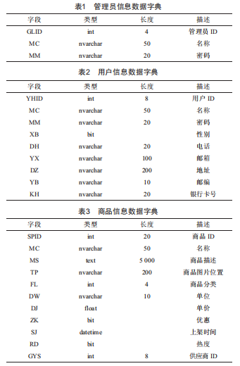 對系統(tǒng)中涉及的各種數(shù)據(jù)項、數(shù)據(jù)結(jié)構(gòu)、數(shù)據(jù)流、數(shù)據(jù)處理邏輯等進行描述和定義,構(gòu)成完整的數(shù)據(jù)字典,從而為系統(tǒng)數(shù)據(jù)庫的設(shè)計和開發(fā)提供依據(jù)。后期進行維護、升級時,也可以根據(jù)數(shù)據(jù)字典對數(shù)據(jù)庫進行優(yōu)化升級。本文所設(shè)計的系統(tǒng)數(shù)據(jù)庫的數(shù)據(jù)字典主要包括管理員信息、用戶信息、商品信息等內(nèi)容。管理員信息、用戶信息、商品信息數(shù)據(jù)字典,分別如表1~表3所示。