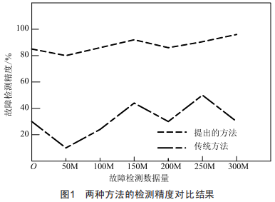 從圖1可以看出,采用提出的智能檢測方法進(jìn)行故障檢測時,故障檢測精度曲線的波動比較小,基本保持在90%左右,而且隨著故障檢測數(shù)據(jù)量的增加,檢測精度也隨之提升。而采用傳統(tǒng)方法,其檢測精度曲線的波動比較大,且檢測精度的平均值約為35%,當(dāng)檢測數(shù)據(jù)量為250M時,檢測精度出現(xiàn)最大值,其最大值為45%。通過對比可以明顯看出,智能檢測方法的檢測精度更高。