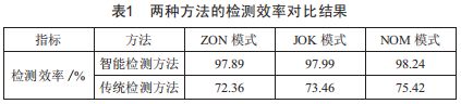 從表1可以看出,在Z0N模式下,智能檢測方法的檢測效率為97.89%,而傳統(tǒng)方法的檢測效率為72.36%:在J0K模式下,智能檢測方法的檢測效率為97.99%,而傳統(tǒng)方法的檢測效率為73.46%:在N0M模式下,智能檢測方法的檢測效率為98.24%,而傳統(tǒng)方法的檢測效率為75.42%。實(shí)驗(yàn)結(jié)果表明,與傳統(tǒng)檢測方法的檢測效率相比,本文提出的智能檢測方法的檢測效率更高。