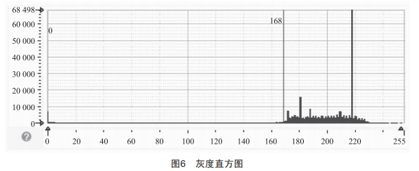 可得到一個(gè)分割后的二值化圖像。閾值分割使用的算子是threshold。具體代碼為threshold(Im一geReduced4Regioas404168):此處選取的是閾值范圍是0~168的區(qū)域。其灰度直方圖如圖6所示,橫坐標(biāo)表示灰度值,縱坐標(biāo)表示各個(gè)灰度值的像素在圖像中出現(xiàn)的頻率。