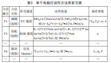 為實(shí)現(xiàn)多層次豐富的燈光變換,需進(jìn)行燈光區(qū)域、燈光場(chǎng)景、單燈動(dòng)作方法(作用通道、動(dòng)作軌跡、操作參數(shù))、多燈組合變化(組合個(gè)數(shù)、分組動(dòng)作進(jìn)行方向、分組動(dòng)作間隔時(shí)間)等方面的設(shè)計(jì)匹配。根據(jù)單燈基本動(dòng)作特征及演示效果,建立如表3所示的方法庫(kù)索引表,動(dòng)作方法概括為連續(xù)和離散兩種變化方式。