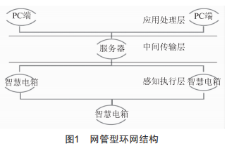 電力設(shè)備監(jiān)測(cè)系統(tǒng)分為3層:設(shè)備端、服務(wù)器及PC端。智慧電箱作為設(shè)備端進(jìn)行數(shù)據(jù)采集,執(zhí)行分閘或合閘命令以及監(jiān)測(cè)數(shù)據(jù):數(shù)據(jù)服務(wù)器對(duì)智慧電箱上傳的設(shè)備狀態(tài)數(shù)據(jù)進(jìn)行實(shí)時(shí)數(shù)據(jù)處理、顯示或轉(zhuǎn)發(fā)給主控室PC端:PC端用于對(duì)電箱進(jìn)行遠(yuǎn)程控制和用電設(shè)備的實(shí)時(shí)監(jiān)控。如圖1所示,本系統(tǒng)與網(wǎng)管型環(huán)網(wǎng)交換機(jī)結(jié)合后,利用光纖環(huán)形網(wǎng)絡(luò)建立比現(xiàn)在單向網(wǎng)絡(luò)更加安全的通信鏈路,不會(huì)因?yàn)橄到y(tǒng)某一方向光纖斷連,造成設(shè)備數(shù)據(jù)丟失,且系統(tǒng)會(huì)實(shí)時(shí)監(jiān)測(cè)網(wǎng)絡(luò)狀態(tài),如果單一方向光纖故障,設(shè)備會(huì)通過(guò)另外的數(shù)據(jù)鏈路發(fā)送數(shù)據(jù)并報(bào)警,提示及時(shí)維護(hù)。