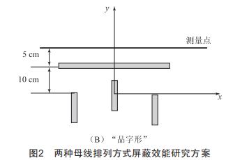 通過查閱文獻(xiàn)資料發(fā)現(xiàn),高壓開關(guān)柜母線室內(nèi)母線的安裝方式主要有"一字型"與"品字形"兩種方式,為此在其他屏蔽條件一致的情況下,可以通過轉(zhuǎn)換母線安裝方式,探索電磁場的強(qiáng)度分布實(shí)況。基于此,筆者為了研究母線排列方式的屏蔽效能,設(shè)計(jì)了"一字型"方案與"品字形"方案,如圖2所示。