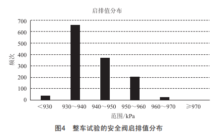 出廠試驗時,安全閥的啟排值所處區(qū)間控制在950~960kPa。整車試驗時,安全閥的啟排值在930kPa以上的占比97%,但同時可以發(fā)現(xiàn),大約有50%的啟排值下降至930~940kPa,30%的啟排值下降至940~950kPa,下降幅度為10~20kPa,具體分布情況如圖4所示。
