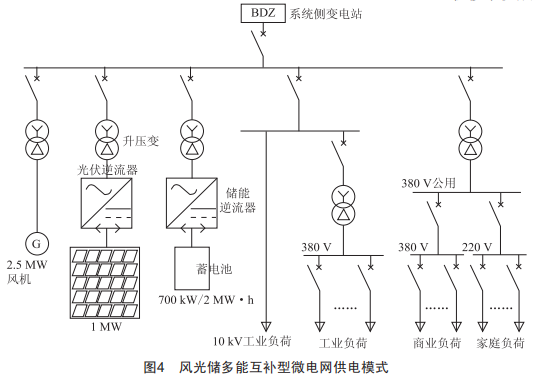 在我國沿海島嶼,該類型微電網(wǎng)也可配合柴發(fā)使用,在各種天氣條件下保證負(fù)荷的持續(xù)供電,顯著提高供電可靠性。因此,風(fēng)光儲互補(bǔ)型微電網(wǎng)供電模式是應(yīng)用最為廣泛的微電網(wǎng)系統(tǒng),也是最適合產(chǎn)業(yè)園區(qū)采用的新能源微電網(wǎng)型式之一。