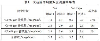 在整個測試過程中,除塵器其他電場供電電源的參數(shù)保持不變,脈沖電源采用基礎(chǔ)、基礎(chǔ)+脈沖兩種方式相結(jié)合的運行方式。根據(jù)表1的4次測試能夠看出,增加脈沖電源后,對粒徑小于0.07um顆粒的除塵效果非常明顯,減少率高達77%,而對其他兩種粒徑粉塵的去除效果并不明顯。因此,脈沖電源適用于微細(xì)粉塵的脫除,可大大提高除塵效果。