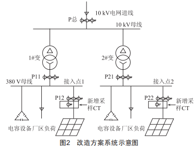 此時(shí),需要在無功補(bǔ)償控制器采集信息中考慮加入光伏電站因數(shù),在光伏并網(wǎng)柜中增加一套與原無功采樣設(shè)備規(guī)格型號一致的采樣C+,兩套電流互感器同向并接入無功補(bǔ)償裝置控制器,如圖2所示。經(jīng)按照該方案改造后,企業(yè)無功補(bǔ)償裝置恢復(fù)正常動(dòng)作,未再出現(xiàn)無功補(bǔ)償電容器組反復(fù)投切以及功率因數(shù)低于電網(wǎng)公司考核要求的情況。