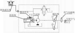 液壓保護(hù)系統(tǒng)如圖1所示,主要包括卸荷閥、滑塊液壓缸、供氣管路、液壓管路及電氣線路。卸荷閥安裝有微動(dòng)開關(guān),當(dāng)大型沖床壓力過大或者壓力不夠時(shí),卸荷閥內(nèi)的平衡活塞向左或者向右移動(dòng),從而控制微動(dòng)開關(guān)向左或者向右移動(dòng),在大型沖床沖壓過程中起到報(bào)警作用,沖床停止:壓縮空氣通過供氣電磁閥,經(jīng)過供氣管路上安裝的減壓閥供氣給卸荷閥,實(shí)現(xiàn)卸荷閥內(nèi)部壓強(qiáng)的控制:滑塊液壓缸通過液壓管路傳輸?shù)叫逗砷y。通過卸荷閥、滑塊液壓缸、供氣管路、液壓管路和電氣線路,實(shí)現(xiàn)液壓保護(hù)系統(tǒng)的氣體傳送、液體傳送和電氣控制。