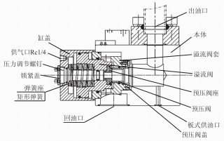 其中,卸荷閥包括卸荷閥本體,卸荷閥本體的上方設(shè)置有出油口,下方安裝有行程開關(guān)和回油口,卸荷閥本體包括溢流閥組件、預(yù)壓閥組件、板式供油口、彈簧組件、供氣口和鎖緊組件,溢流閥組件包括溢流閥套和溢流閥,溢流閥套套接于溢流閥上,并與頂蓋連接,預(yù)壓閥組件包括預(yù)壓閥、用于安裝預(yù)壓閥的預(yù)壓閥座以及蓋設(shè)在預(yù)壓閥座上方的預(yù)壓閥蓋,預(yù)壓閥組件和溢流閥組件之間設(shè)置有板式供油口,彈簧組件鑲嵌于溢流閥組件的內(nèi)部,彈簧組件包括矩形彈簧和安裝矩形彈簧的彈簧座,彈簧組件的出口端安裝有鎖緊組件,鎖緊組件包括鎖緊蓋和壓力調(diào)節(jié)螺釘,通過壓力調(diào)節(jié)螺釘控制卸荷閥內(nèi)部壓力的大小,所述供氣口位于缸蓋的下端,具體結(jié)構(gòu)如圖2所示。