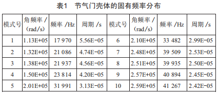 汽車的節(jié)氣門屬于發(fā)動(dòng)機(jī)的進(jìn)氣系統(tǒng),節(jié)氣門就是一個(gè)可控制的閥門,通過(guò)調(diào)節(jié)節(jié)氣門的閥門,可以調(diào)節(jié)進(jìn)入發(fā)動(dòng)機(jī)的氣體流量。車輛的振動(dòng)來(lái)源非常復(fù)雜,主要來(lái)自5個(gè)方面,分別是發(fā)動(dòng)機(jī)和傳動(dòng)系統(tǒng)、制動(dòng)系統(tǒng)、轉(zhuǎn)向系統(tǒng)、懸架系統(tǒng)和車身與車架系統(tǒng)。本次研究的主要是發(fā)動(dòng)機(jī)和傳動(dòng)系統(tǒng)的振動(dòng)對(duì)于節(jié)氣門的影響,因?yàn)楣?jié)氣門與發(fā)動(dòng)機(jī)是直接相連的,發(fā)動(dòng)機(jī)系統(tǒng)的振動(dòng),直接決定了節(jié)氣門系統(tǒng)的外部激勵(lì)。來(lái)自發(fā)動(dòng)機(jī)的振動(dòng)主要是由于發(fā)動(dòng)機(jī)內(nèi)的燃?xì)鈮毫瓦\(yùn)動(dòng)零件的運(yùn)動(dòng)不平衡造成的,其中由于曲軸的扭振帶來(lái)的影響也不可以忽略。同時(shí),由于節(jié)氣門進(jìn)氣前和進(jìn)氣后的壓力不平衡,導(dǎo)致的節(jié)氣門振動(dòng)也不可忽略。表1為節(jié)氣門殼體在不同模態(tài)下的固有頻率,車輛在設(shè)計(jì)時(shí)應(yīng)當(dāng)避免振動(dòng)長(zhǎng)時(shí)間處于殼體的固有頻率之下。