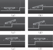 為了驗(yàn)證機(jī)器人的越障性能,在ADAMs中建立了臺(tái)階虛擬障礙,并根據(jù)結(jié)構(gòu)設(shè)計(jì)與優(yōu)化的參數(shù)建立了機(jī)器人虛擬樣機(jī)模型,進(jìn)行運(yùn)動(dòng)學(xué)仿真。機(jī)器人跨越臺(tái)階的過(guò)程如圖6所示,從仿真可知,機(jī)器人可通過(guò)調(diào)整前后擺臂姿態(tài)實(shí)現(xiàn)質(zhì)心調(diào)節(jié),并適應(yīng)障礙高度,驗(yàn)證了多輪腿機(jī)構(gòu)的可行性。