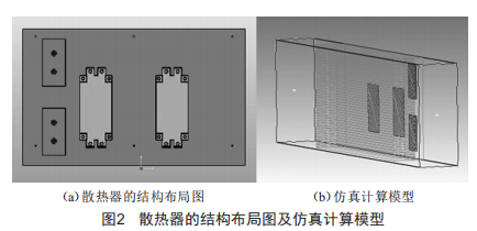 本裝置采用模塊化設(shè)計(jì),每個機(jī)柜中放置若干個功率單元,結(jié)構(gòu)緊湊,可靠性高。每個功率單元中,主要發(fā)熱器件為IGBT模塊以及均壓電阻。IGBT模塊的損耗來源于內(nèi)部的IGBT芯片和二極管芯片的損耗。一個散熱器上放置兩個IGBT模塊以及兩個均壓電阻,每個IGBT模塊的損耗約為700w,每個均壓電阻的損耗為40w。為了保證仿真精度,必須合理地設(shè)置仿真參數(shù)。仿真參數(shù)設(shè)置如下:初始散熱器的長、寬、高分別為450mmx90mm×260mm,散熱器的材質(zhì)為鋁,導(dǎo)熱系數(shù)為200w/(m·k),基板的厚度為10mm,翅片的長度為80mm,翅片的數(shù)量為30,厚度為1mm。其他邊界條件為:環(huán)境溫度為40C,進(jìn)口風(fēng)速為4m/s,忽略輻射換熱。散熱器的結(jié)構(gòu)布局圖與仿真計(jì)算模型如圖2所示。