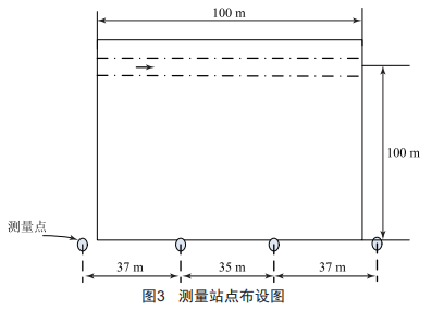 如圖2所示,H為攝影距離,本文取I00m:f為攝影機主距,本文取17mm:a為8.8mm??紤]到在100m測量范圍內的站點布設密度,基線應盡可能長,但要考慮重疊度,故取基線B為37m,重疊度為48%,沿著飛機航向需要布設4個測量站點,如圖3所示。