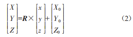 式中,(X,y,Z)為人工標志點的物方空間坐標:(X+,y+,Z+)為飛機質心的物方空間坐標:R為飛機姿態(tài)角所組成的旋轉矩陣。