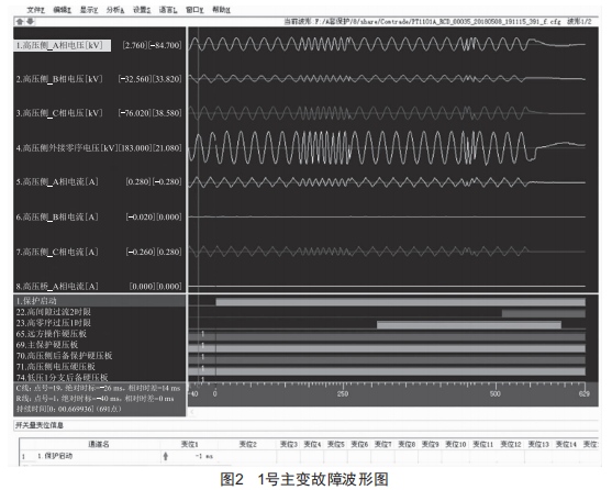 110kV高溝變側,2018一05一08T19:11:15.392,110kV高溝變1號主變A套保護、B套保護高壓側零序過壓1時限動作,1號主變故障波形如圖2所示。