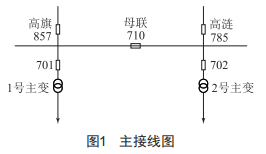 110kV高溝變單母分段接線,110kV高旗857線、高漣785線分別來自220kV變電站甲、220kV變電站乙,110kV分段710開關熱備用,110kV1號、2號主變分別接于110kVⅠ、Ⅱ段母線。主接線圖如圖1所示。