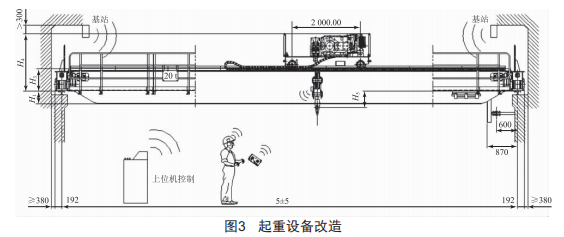 對(duì)原有設(shè)備進(jìn)行升級(jí)改造(圖3),改造內(nèi)容如下:(l)現(xiàn)場設(shè)立中控室,遠(yuǎn)程無線控制起重設(shè)備:(2)電機(jī)全部更換為變頻電機(jī),并加裝編碼器:(3)鉤頭部位安裝車載型發(fā)射裝置:(4)吊鉤組加裝電子秤,并通過信號(hào)發(fā)送到中控室:(5)起重設(shè)備加裝PLC控制系統(tǒng):(6)設(shè)計(jì)加裝多功能遙控器:(7)電控加裝防搖擺功能。