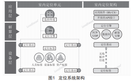 LocalSense通過在庫房建立定位基站,利用無線脈沖測距來實(shí)現(xiàn)位置檢測,將實(shí)際區(qū)域劃分為虛擬區(qū)域網(wǎng)格,通過人員、設(shè)備及物料佩戴、張貼發(fā)射牌形式,區(qū)別各點(diǎn)位置信息、路徑信息,將各信息反饋上傳監(jiān)控終端來統(tǒng)一進(jìn)行安全管理、記錄、發(fā)出警告以及上傳管理設(shè)備的MES系統(tǒng)進(jìn)行強(qiáng)行干預(yù)停機(jī)。LocalSense虛擬區(qū)域定位系統(tǒng)的架構(gòu)如圖1所示。