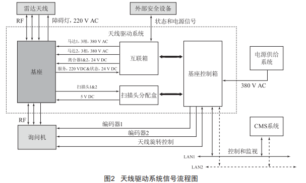 天線驅(qū)動系統(tǒng)的信號流程如圖2所示,從雷達(dá)機(jī)房上到天線基座一共有9根線纜,其中,和差控制3根射頻線纜由雷達(dá)機(jī)柜直接連接到天線旋轉(zhuǎn)較鏈,而后連接到LVA天線。有兩根線纜從雷達(dá)機(jī)柜到PCB(基座控制箱)連接到方位掃描分配盒,而后連接到編碼器,用于編碼器供電(+5VDC)和方位信號傳輸。