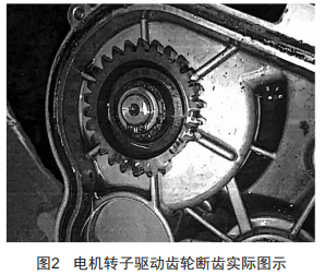 (3)拆解執(zhí)行機(jī)構(gòu)后,骨架油封正常,檢查發(fā)現(xiàn)電機(jī)轉(zhuǎn)子驅(qū)動(dòng)齒輪斷齒兩顆,如圖2所示。