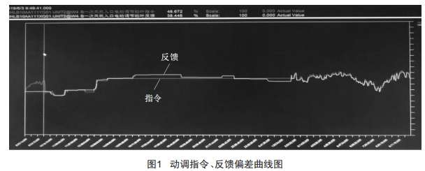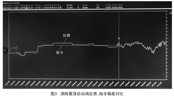反饋指令(2)檢查所有電動(dòng)調(diào)節(jié)執(zhí)行機(jī)構(gòu)反饋,除一次風(fēng)機(jī)有同樣問(wèn)題外,其他設(shè)備未發(fā)現(xiàn)異常。6月0日下午,將一次風(fēng)機(jī)死區(qū)從0.5%改設(shè)為1%后,震蕩消除,如圖3所示。