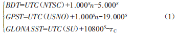 式中 , UrC(NrSC) 、UrC(USN0) 、UrC(SU)分別為中國(guó) 、美國(guó)和俄羅斯所維持的UrC時(shí):n為國(guó)際地球自轉(zhuǎn)服務(wù)發(fā)布的跳秒數(shù):TC為GL0NASSr與UrC(SU)之間存在的lmS以內(nèi)的系統(tǒng)差。