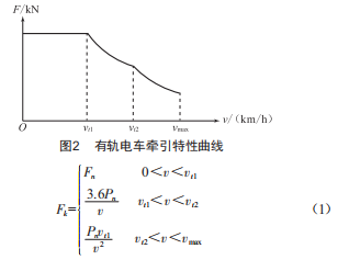 與地鐵相似,有軌電車的牽引力是與速度相關(guān)的函數(shù),分為三段式。啟動加速后為恒力牽引,功率不斷上升,此為恒轉(zhuǎn)矩區(qū);到達額定功率后功率不再上升,牽引力減小,速度繼續(xù)上升,此為恒功率區(qū);在自然特性區(qū),列車的牽引力與運行速度的平方成反比關(guān)系,最大功率隨速度增大而減小。牽引特性曲線如圖2所示。