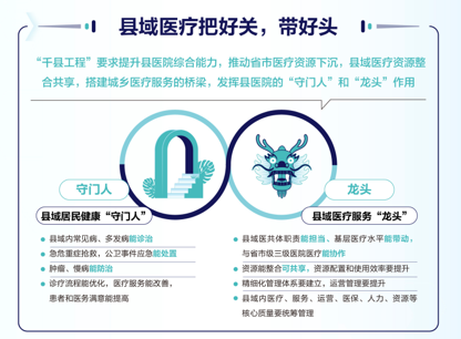 對(duì)于縣城居民而言,縣醫(yī)院是保衛(wèi)生命健康的第一道防線,是聯(lián)接城鄉(xiāng)醫(yī)療服務(wù)體系的紐帶?!扒Эh工程”的一個(gè)核心目標(biāo),就是推動(dòng)省市醫(yī)療資源下沉,縣域醫(yī)療資源整合共享,搭建城鄉(xiāng)醫(yī)療服務(wù)的橋梁。