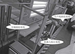 該系統(tǒng)由四部分構(gòu)成:車(chē)輛跟蹤系統(tǒng)、輸送線跟蹤系統(tǒng)、機(jī)器視覺(jué)定位系統(tǒng)和協(xié)作機(jī)器人執(zhí)行系統(tǒng),系統(tǒng)整體構(gòu)成如圖2所示。利用車(chē)輛跟蹤系統(tǒng)和輸送線跟蹤系統(tǒng)計(jì)算車(chē)輛進(jìn)入工位的位置信息,機(jī)器視覺(jué)系統(tǒng)通過(guò)圖像處理提取特征,并通過(guò)訓(xùn)練模板確定標(biāo)準(zhǔn)位置圖像,結(jié)合相機(jī)與機(jī)械手的坐標(biāo)系標(biāo)定,實(shí)現(xiàn)檢測(cè)定位功能。