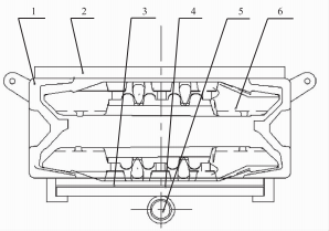 1一中部槽幫;2一橫撐;3一底板;4一閘板;5一開關(guān)千斤頂;6一刮板鏈。