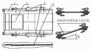 再就是工作面采空區(qū)常用的充填刮板機(圖1)的性能也不盡人意:首先是充填材料在刮板機中板上運輸,中板上開投料口封堵不便,此處空間狹小,下刮板鏈容易刮卡磨損活動封板,為避讓空間,中板開口處采用較薄的板材拼接,不但費工料,而且最易損壞(磨損快)。需要左右兩個千斤頂開關(guān)活動封板,結(jié)構(gòu)復雜且難同步,易別卡。工作面有仰俯角時,中部槽中的物料非常容易脫槽而出,運不到需要充填的有效部位等。