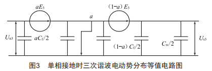 三次諧波電壓的繼電保護(hù)是否動(dòng)作 , 是通過(guò)比較中性點(diǎn)三次諧波電壓和機(jī)端三次諧波電壓來(lái)實(shí)現(xiàn)的 ,單相接地時(shí)三次諧波電動(dòng)勢(shì)分布等值電路圖如圖3所示 。其中 ,E3為三次諧波電動(dòng)勢(shì) , Us3為機(jī)端三次諧波電壓 , Un3為中性點(diǎn)三次諧波電壓 ,Cf為發(fā)電機(jī)對(duì)地電容 ,Cw為機(jī)端出線及設(shè)備對(duì)地電容。