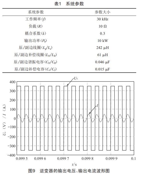 根據(jù)表l設(shè)計參數(shù),搭建仿真電路。圖9為逆變器的輸出電壓電流波形圖,可得系統(tǒng)處于諧振狀態(tài)。