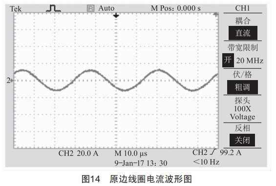 圖14為原邊線圈電流波形圖,可看出電流畸變率很小,波形質(zhì)量高。