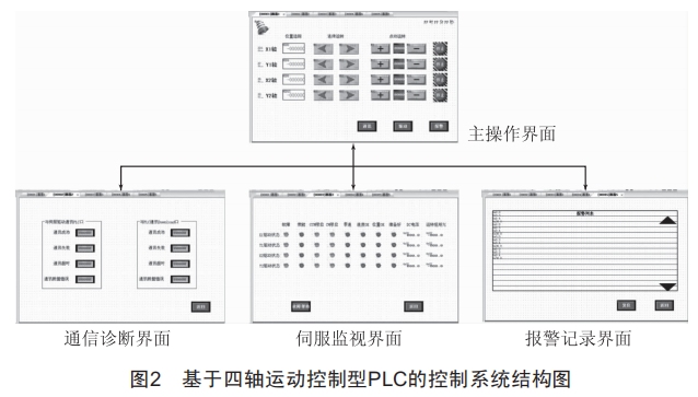 信捷TH765系列HMI觸摸操作顯示屏通過TOuchwin編輯軟件可快速組態(tài)人機(jī)界面,實(shí)現(xiàn)多個(gè)界面,如圖3所示,包括操作與位置顯示界面、伺服驅(qū)動(dòng)器狀態(tài)界面、報(bào)警與歷史記