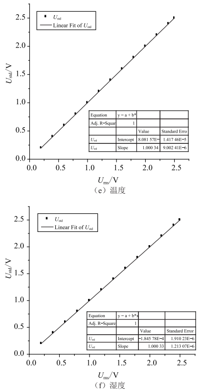 納伏表和各通道等間隔選取了多個電壓值進(jìn)行了測量,每個電壓值測試5個值,求取平均值作為此點的測量結(jié)果。用軟件Origin進(jìn)行最小二乘擬合,如圖2所示。各模擬轉(zhuǎn)換通道的最小二乘擬合函數(shù)以及其各次項系數(shù)如表2所示。