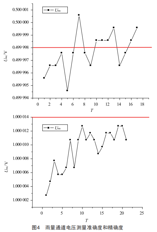 對系統(tǒng)測量單點電壓的準(zhǔn)確性和穩(wěn)定性進(jìn)行了研究。圖4列出了雨量通道對標(biāo)準(zhǔn)電壓源輸出0.5V和1V時的測量情況,圖中粗橫線為測量過程中納伏表記錄的電壓平均值。結(jié)果顯示,此系統(tǒng)的電壓測量平均誤差低于10uV,方差分別為2.36×10-12V2和8.55x10-12V2,表明系統(tǒng)具有較高的準(zhǔn)確度和穩(wěn)定性。