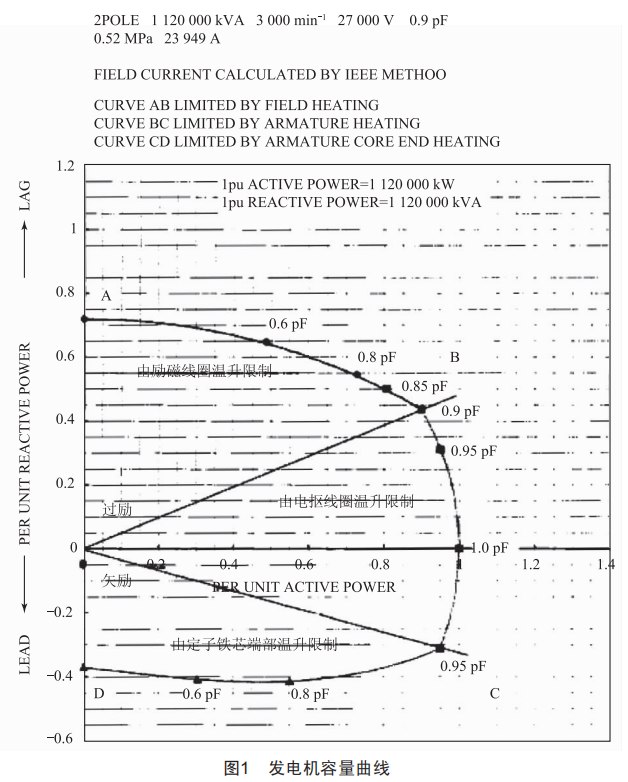發(fā)電機(jī)容量曲線(xiàn)(圖1)上的橫坐標(biāo)為有功功率,縱坐標(biāo)為無(wú)功功率,例如,功率圓第6點(diǎn)有功功率取1065(橫坐標(biāo)在0.95pF位置),從曲線(xiàn)圖上就可以查出該負(fù)荷下對(duì)應(yīng)的無(wú)功功率上限值492(縱坐標(biāo)在0.439pF位置)。
