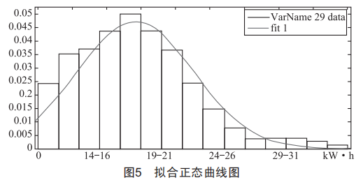 為證明滿足其使用條件,將數(shù)據(jù)導(dǎo)入程序中,用test函數(shù)檢驗曲線是否服從正態(tài)分布規(guī)律,當(dāng)H為l的情況下不是正態(tài)分布,當(dāng)H為0的情況下是正態(tài)分布,充電電量對應(yīng)H=0,因此擬合出充電電量的正態(tài)分布圖(圖5),并計算得充電電量服從u=14.2263、6=8.4458的正態(tài)分布。