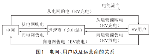 為了對電動汽車負(fù)荷進(jìn)行描述,有必要分析電動汽車充電行為特性(充電開始時刻、連接時長和充電電量)的分布規(guī)律。此外,電動汽車的使用必然要與電網(wǎng)產(chǎn)生互動,在此過程中就會涉及電網(wǎng)、用戶以及運營商的利益關(guān)系,用戶可以直接從電網(wǎng)交換電能,或者選擇運營商進(jìn)行充電服務(wù),三者的關(guān)系如圖1所示。